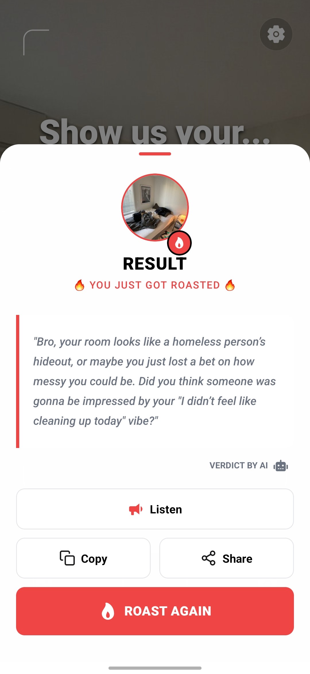 Got roasted? Share your AI-generated roast with friends and see who has the messiest space. It's all in good fun!